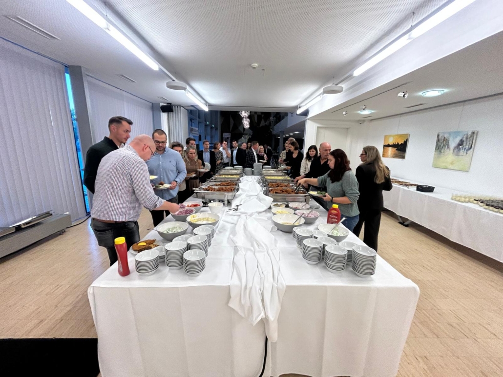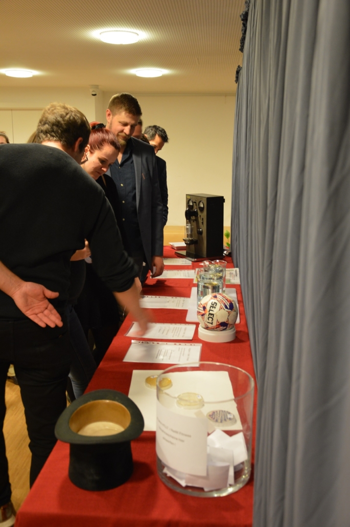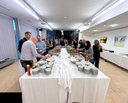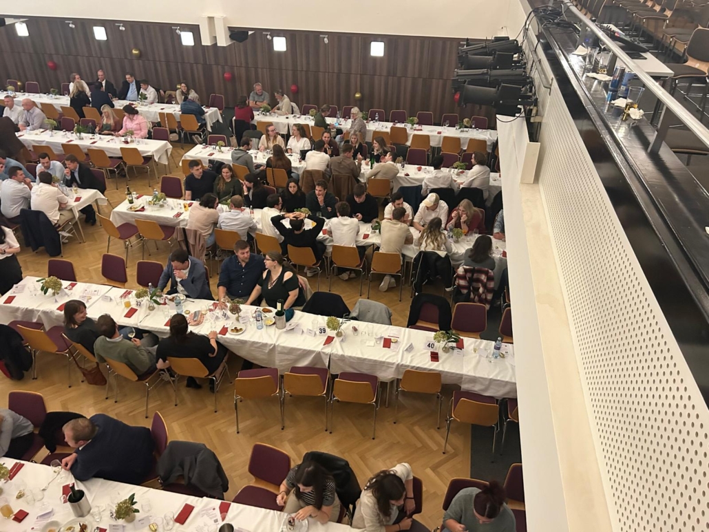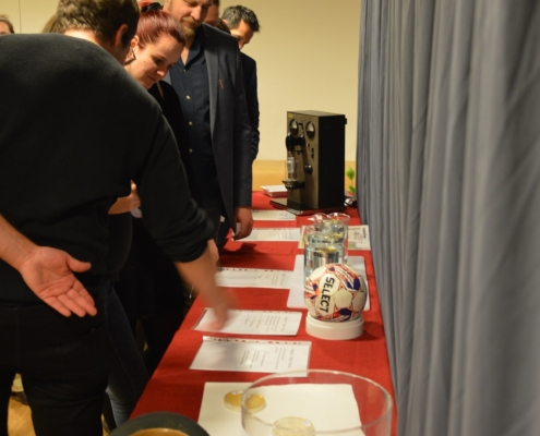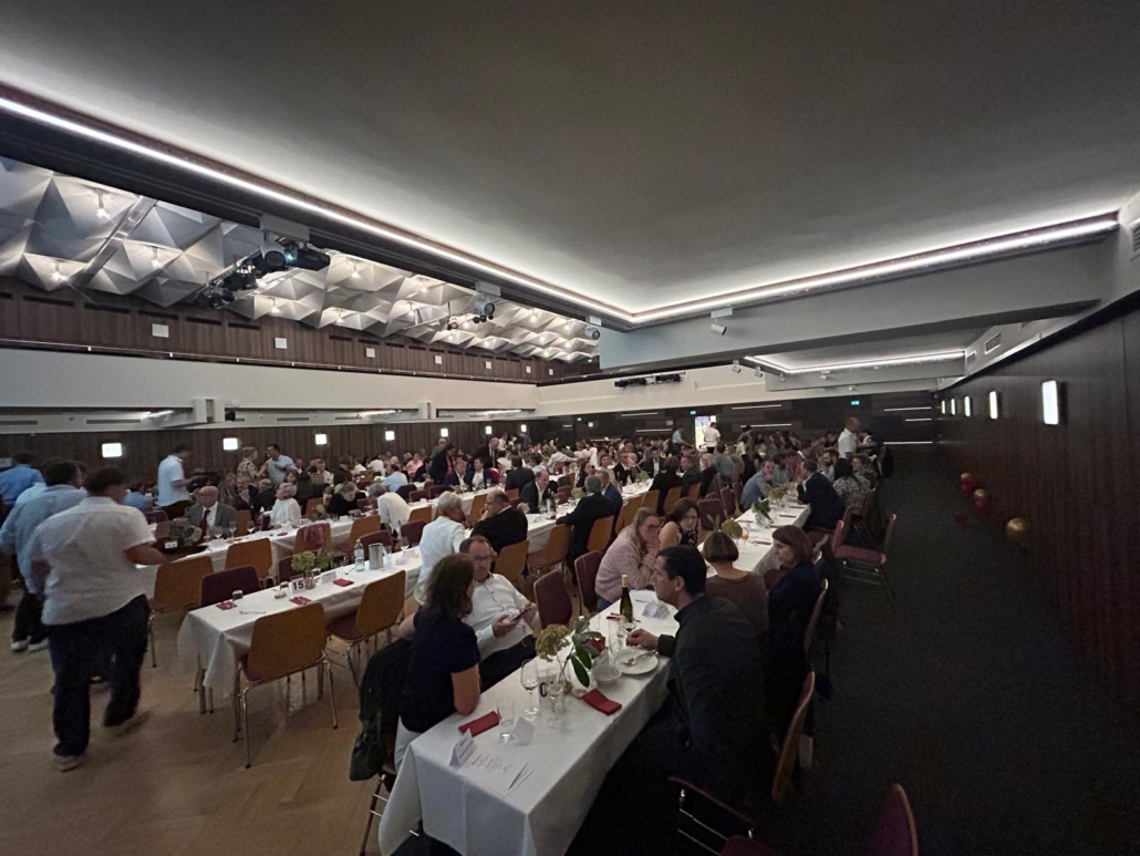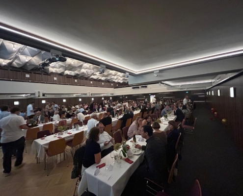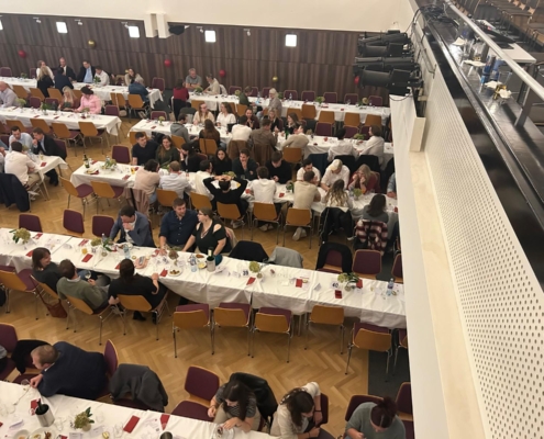 Ein umfangreiches Buffet, wo für jeden Geschmack etwas dabei war, läutete nach dem Bühnenprogramm den nächsten Teil der Feier ein, der geprägt war von vielen langen Gesprächen zwischen alten Freunden und Bekannten, die sich teilweise viele Jahre nicht mehr gesehen haben, und neuen Bekanntschaften, die durch das verbindende Band unserer Schule geknüpft werden konnten. Der Absolventenverein lud zu einer Weinbar, welche gespickt war mit erlesenen Tropfen, gibt es schließlich unter unseren Absolvent*innen so manche Top-Winzer*in, der*die eine Auswahl ihres Sortiments spendete. Der Reinerlös kommt einem Schulprojekt zugute. Spannend und knifflig ging es im Obergeschoß zu, wo Heinz Köhler zu einem Mitmachquiz rund um chemische und physikalische Fragen und Phänomene geladen hat. Unter den Mitmachenden wurden Weine verlost und wir gratulieren den Gewinner*innen! Das Läuten einer für alle Absolvent*innen wohlbekannten Glocke läutete zwar nicht zum Schlussmachen und Zusammenräumen im Labor, aber zum allmählichen Ende der Feier.